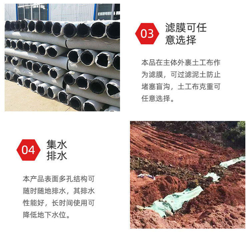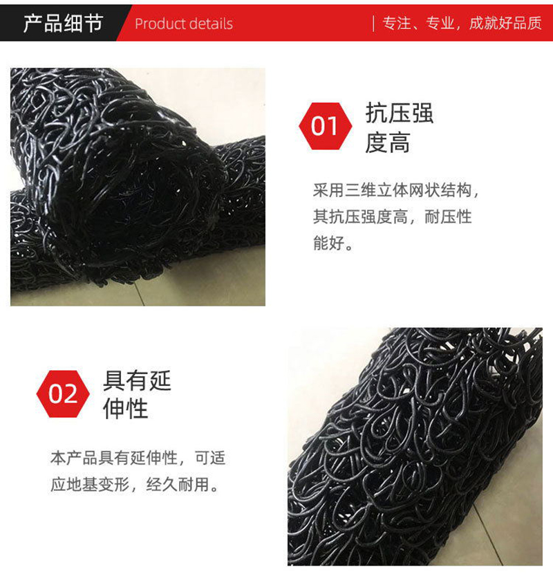 2、由于是立體結(jié)構(gòu),其空隙率為80-95%,構(gòu)成空間與管理同且輕便,抗壓性能比管結(jié)構(gòu)的樹脂強10倍以上,因此,即使因超負(fù)荷被壓,但由于是立體結(jié)構(gòu),故殘余空隙也達(dá)50%以上,不存在不通水的問題,無需考慮會被土壓力壓壞。